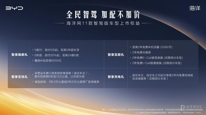 【太平洋汽车 新车频道】2025年2月10日,比亚迪官方发布了海洋网旗下的海狮07EV智驾版,中低配车型搭载天神之眼C高阶智能驾驶辅助系统-DiPilot 100,高配车型搭载天神之眼B高阶智能驾驶辅助系统-DiPilot 300,售价:18.98-23.98万元。